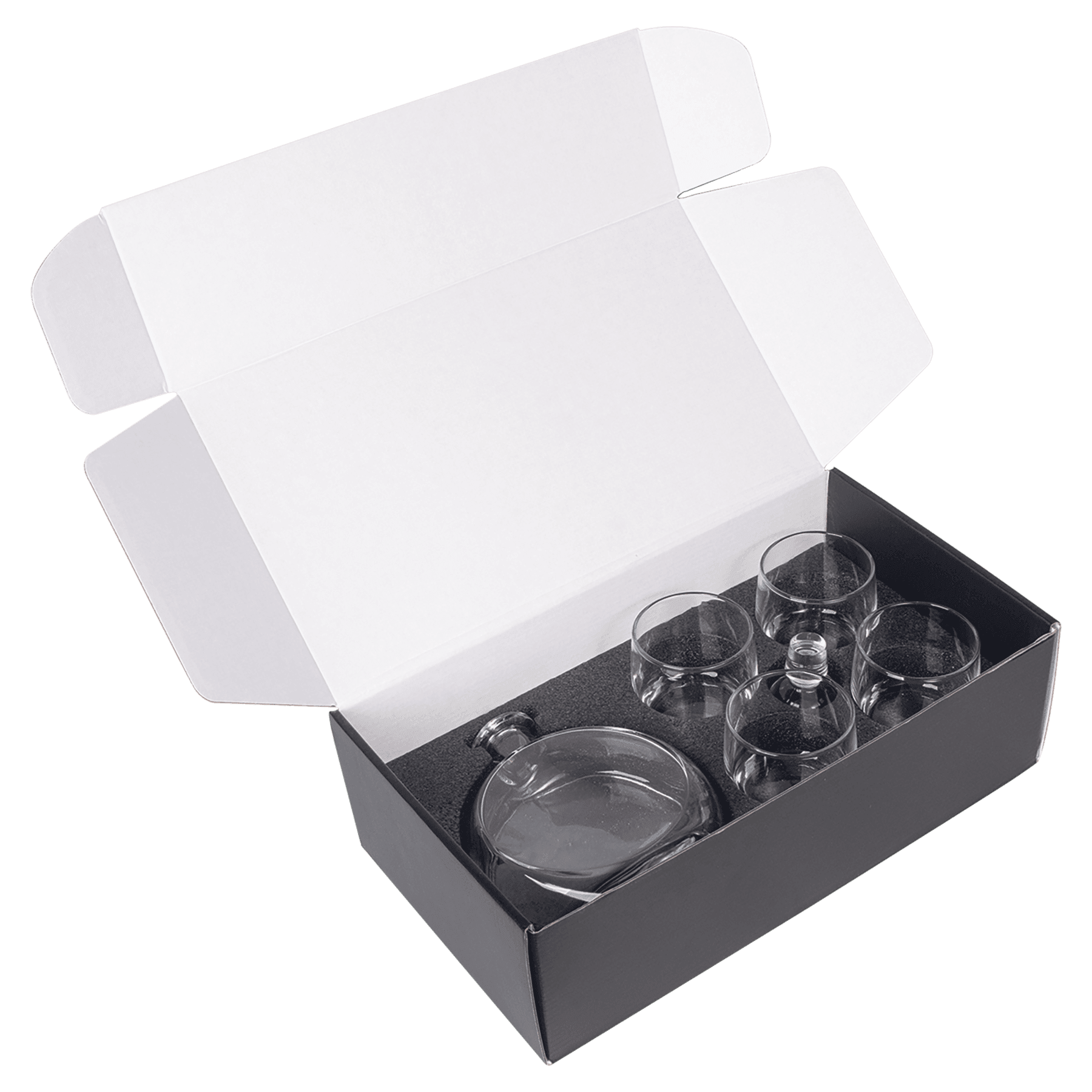 This refined 750 ml round glass decanter set includes a stopper-lid decanter and four 10 oz. rocks glasses, all designed for clarity, balance, and everyday elegance. Each piece can be customized with your logo, monogram, or message — perfect for corporate gifts, client appreciation, or promotional events.